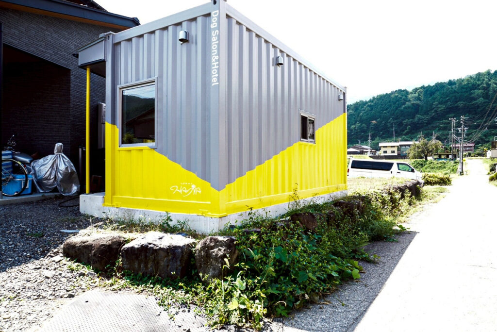 今回ご紹介するのは、20ftコンテナのドッグトリミングサロン&ドッグホテルの事例です。グレートイエローのツートンカラーで空間を印象的に演出し、写真映えも意識してお作りしました。