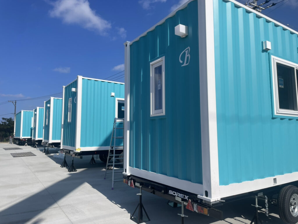 沖縄県宮古島のリゾートエリアに、20ftハイキューブコンテナ6台とトレーラーシャーシ6台を活用したコンテナトレーラーホテルを施工しました。